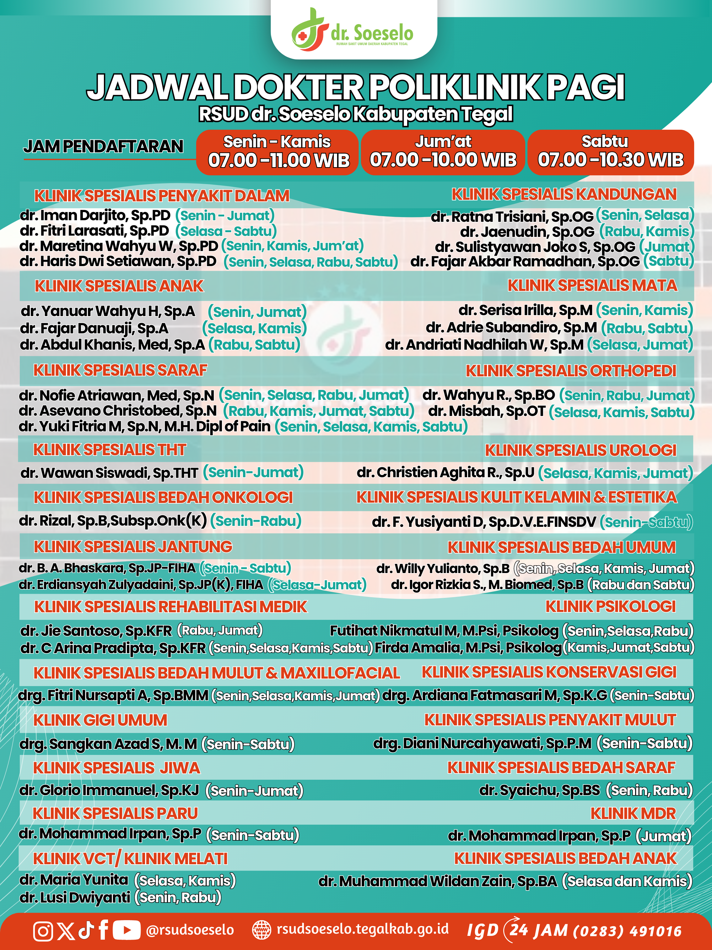 Jadwal Klinik RSUD dr. Soeselo Kabupaten Tegal Posted on 13 Juni 2017 , Updated on 09 September 2025 oleh owner ditulis di pengumuman.